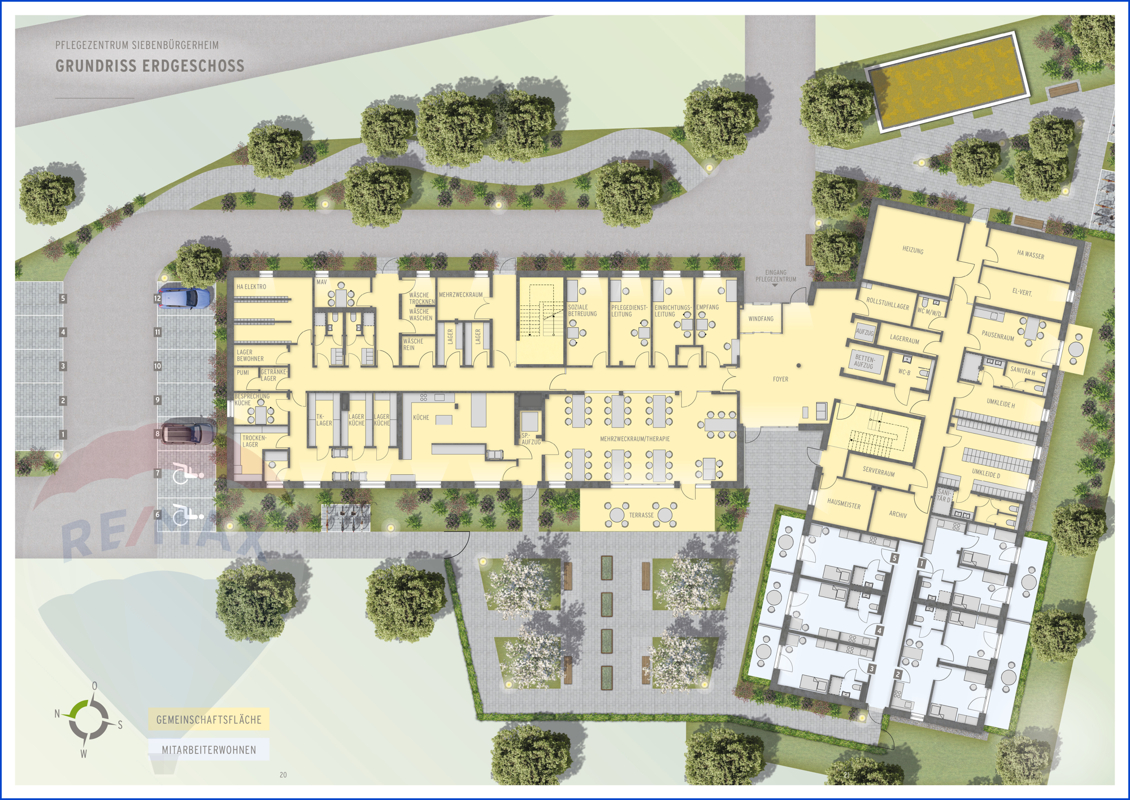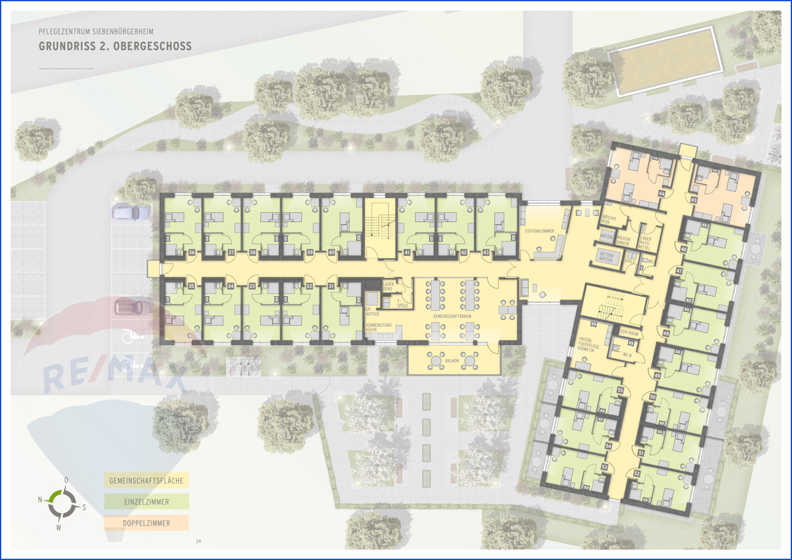 Das neue Pflegezentrum Siebenbürgerheim erfüllt höchste Ansprüche an Funktionalität, Komfort und Pflegequalität:Barrierefreiheit: Die gesamte Anlage ist barrierefrei nach DIN 18040-2 geplant. Alle Pflegezimmer sind schwellenlos erreichbar, mit großzügigen Türbreiten (Pflegezimmer: mind. 106 cm) und rollstuhlgerechten Bädern. Auch Schalter, Türdrücker und Übergänge zu Balkonen und Terrassen sind entsprechend angepasst.